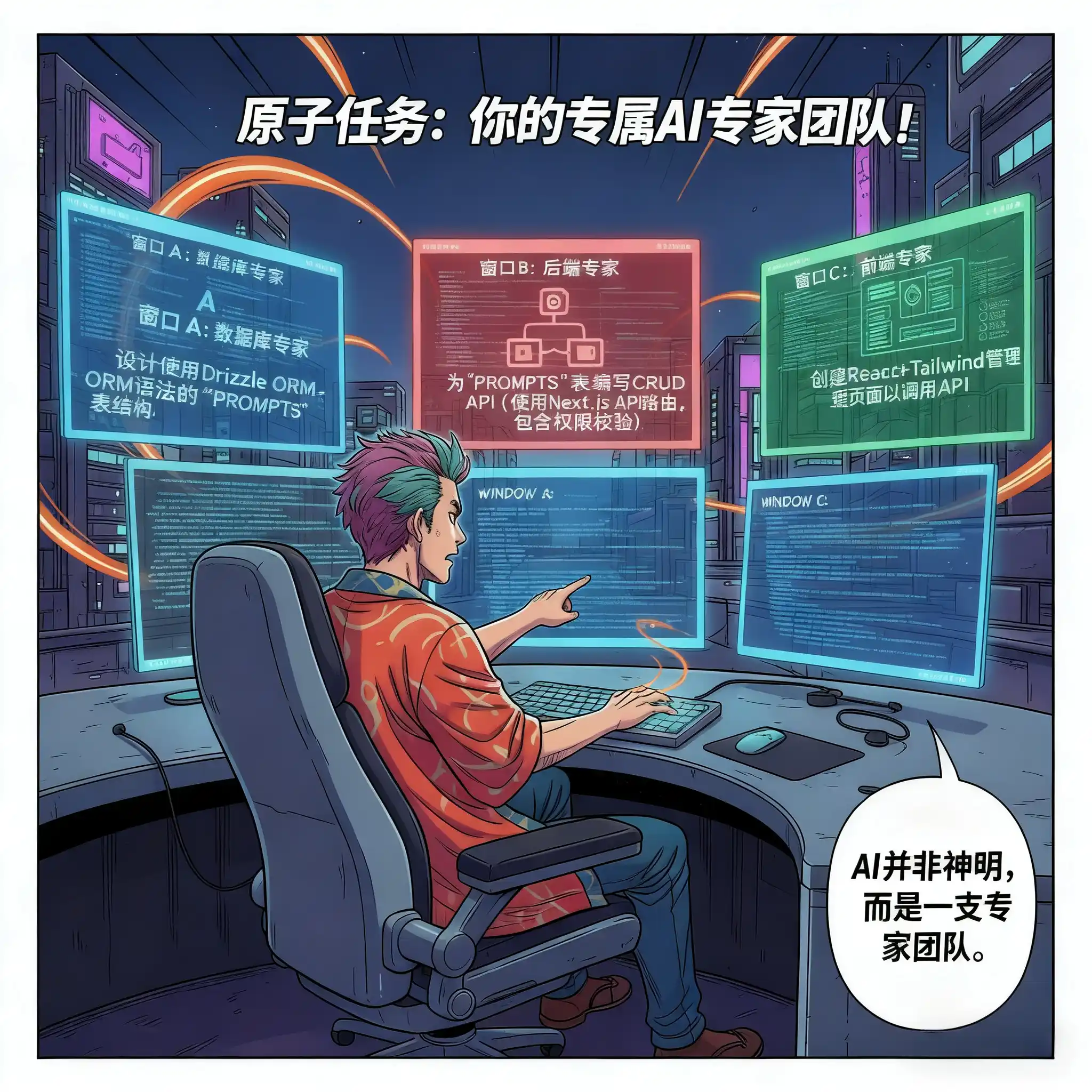 表结构,用Drizzle ORM的语法写出来。”• 窗口B(后端专家):“这是表结构,给我写出对应的增删改查API,用Next.js的API Route实现,做好权限校验。”